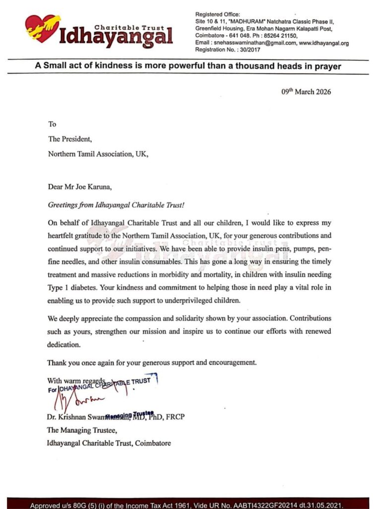 - Idhayangal Charitable Trust, based in Coimbatore, supports underprivileged children living with Type 1 diabetes. By providing insulin, medical care, and essential support, the Trust gives these children more than treatment — it gives hope. Hope to live, to dream, and to build a healthier future. Donated £1000 through Dr.Krishnan Swaminathan - Managing Trustee